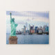 La estatua de la Libertad con los antecedentes del World Trade Center, monumentos de la ciudad de Nueva York.