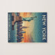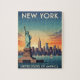 Afiche de viaje retro con la icónica Estatua de la Libertad en un telón de fondo de la ciudad de Nueva York y un vibrante cielo.