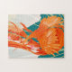 Puzzle with bright and beautiful illustration of a scene from a fairy tale. The Firebird, a golden cage and apples. Orange, blue and gold colors.