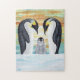 Padres pingüinos del emperador de la Antártida con su linda bebé pingüino. Pintura de Acrílico de la Familia Pingüino de Donna Leger hecha para diseños de ironía. Todos Los Derechos Reservados.