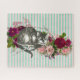 El divertido y sofisticado collage digital presenta un fondo rayado rosa y aqua, un ramo de flores de tintes rosa y borgoña y el ilustracion de gatos de Alicia en el País de las Maravillas Cheshire.