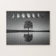 Fases lunares con estrellas brillantes y árbol solitario cerca del lago en blanco y negro. Un rompecabezas divertido para toda la familia.