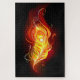 Una brillante pluma de pavo real hecha de fuego y llama sobre fondo negro.