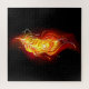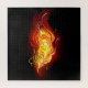 Una brillante pluma de pavo real hecha de fuego y llama sobre fondo negro.