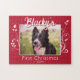 Lovely First Christmas Puppy Photo Foliage Red puzzle. Lovely white foliage and a custom dog name in a trendy script. Personalize the puzzle with your dog`s photo, name and year of birth - insert your favorite puppy photo. You can use this custom puzzle for any pet. A lovely holiday keepsake for a dog owner.