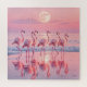 Los flamencos rosados se alinean con elegancia a lo largo de una playa reflejada en el agua tranquila a medida que una luna rosa llena se eleva en el cielo pastel