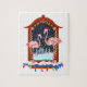 Navidades flamencos rosados celebran rompecabezas de rompecabezas. El diseño presenta dos flamencos rosas con sombreros de santa en una escena de vacaciones con luces de Navidad también! Un puzzle para la familia o los amigos que viven en un lugar tropical con flamencos, o para los amantes de los flamencos rosas.