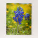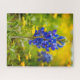 Una vista de cerca de un hermoso Bluebonnet de Texas con hojas perfectas, tallo y hojas con un suave enfoque de fondo floral amarillo en formato vertical o retrato.