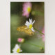Este rompecabezas presenta una imagen de una delicada mariposa amarilla clara sentada en una margarita con flores rosas en el fondo.
