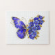 Joyería, azul, zafiro, mariposa floral brillante con ala decorada con flores azules y preciosas con hojas de oro sobre fondo blanco.