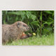 Adorable Groundhog AKA woodchuck recogiendo una flor de diente de león