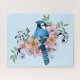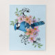 Un pájaro marino azul rodeado de flores primaverales rosas, violetas y color melocotón pastel colocadas sobre un fondo azul claro.