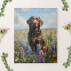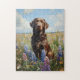 Este bonito diseño de perro cuenta con un simpático Labrador de chocolate en medio de un vibrante campo de flores de lupino, que captura el vínculo entre la naturaleza y esta casta adorable. Los tonos cálidos y terrenales del perro y el colorido telón de fondo floral crean un ambiente encantador y acogedor.