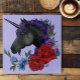 Un unicornio negro con flores azules, moradas y rojas en un fondo morado claro