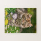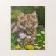 Un gatito marrón precioso joven del Coon de Maine del tabby que se sienta curiosamente en un prado florido en primavera. Una foto linda del gato del coonie tomada por Katho Menden. Este juego animal del rompecabezas de la foto es una idea del regalo para los amantes del gato. http://www.zazzle.com/kathom_photo