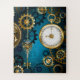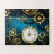 fondo turquesa, texturado, de vapor punk con bronce y oro, llave de plata y reloj. Estilo Steampunk.