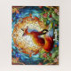 Este diseño vibrante reproduce el aspecto de vidrios manchados y cuenta con un zorro rojo bonito entre los árboles al atardecer.