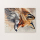 Un zorro rojo con una acuarela detallada con ojos expresivos se representa contra un fondo suave y borroso. Los colores naturales realzan el aspecto realista.