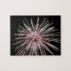 Un brillante destello blanco, rosa y verde de un programa de fuegos artificiales del 4 de julio de las vacaciones ilumina el cielo negro azabache.