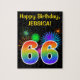 Este divertido y vibrante diseño de rompecabezas presenta un patrón colorido inspirado en fuegos artificiales de celebración, junto con el número "66" que tiene un arcoiris multicolor como patrón gradiente, sobre un fondo de color negro. También incluye un nombre personalizado y un mensaje de evento, como un saludo de cumpleaños. Un rompecabezas como este podría ser una manera divertida de enviar un mensaje de cumpleaños para reconocer el 66 cumpleaños de alguien. [~Z0000329]