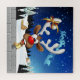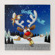 A Funny cartoon reindeer with a bright red nose and large white antlers, adorned with a red and gold bow, peeks through an open window. Outside, a snowy landscape with silhouetted pine trees and a small, glowing house is visible under a dark blue, star-filled night sky. Santa's sleigh pulled by reindeer is flying in the distance. The scene evokes a festive and whimsical Christmas atmosphere. Original Vector Art Copyright BluedarkArt TheChameleonArt.