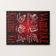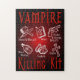 La imagen es un ilustracion estilizado de un kit de asesinato de vampiros. Las palabras "VAMPIRE" y "KILLING KIT" están escritas en letras grandes, rojas, de estilo gótico en la parte superior e inferior, respectivamente. En el medio, hay seis dibujos delineados en blanco de objetos que tradicionalmente se usan para matar vampiros: una estaca y un mallet, una biblia, una pistola con balas de plata, una botella de agua bendita, ajo y una cruz. Un regalo perfecto para los amantes de los Góticos y los vampiros.