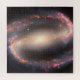 Galaxia espiral NGC 1300. La luz de radio está representada en amarillo y resalta las nubes de gas molecular frío que proporcionan la materia prima de la que se forman las estrellas. Los colores rojo y magenta capturan el impacto de estrellas jóvenes y masivas en el gas que las rodea. La luz visible y ultravioleta resalta los carriles de polvo en oro y estrellas calientes muy jóvenes en azul.
