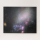La galaxia irregular NGC 4485, localizada a 25 millones de años luz en la constelación norte de Canes Venatici. El lado derecho de la galaxia está en llamas con formación de estrellas, mostrada en la plétora de estrellas azules jóvenes y nebulosas rosadas incubadoras de estrellas. El lado izquierdo contiene indicios de la estructura espiral anterior de la galaxia, que en algún momento estaba experimentando una evolución galáctica normal. La galaxia culpable más grande, NGC 4490, está en el fondo del cuadro. Las dos galaxias se separaron hace millones de años y ahora están separadas por 24.000 años luz. El tira y afloja gravitacional entre ellos creó parches de gas de mayor densidad y polvo en ambas galaxias. Esta actividad desencadenó una ráfaga de formación de estrellas.