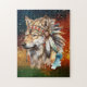 Hermoso lobo marrón gris con una cabeza de plumas con fondo galáctico.