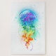 Gran medusa de gelatina, de dibujo artístico y brillante, con largos tentáculos sobre blanco, pintados con fondo multicolor de acuarela. Marisco arcoiris.