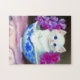 ¡El rompecabezas tiene un gatito blanco dulce! Este gato suavizado posa en un tazón azul adornado con flores rosas. ¡Un regalo maravilloso para los amantes del gato y del arte victoriano!