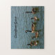 Canadiense Geese, un gander, un ganso y sus chismes, en el agua del lago con tu saludo personalizado, el lago, la cabaña de frente o el nombre de la casa del lago y tu nombre familiar todo personalizable en este desafiante y hermoso rompecabezas fotográfico. Mascota de Geese canadiense de por vida y en esta fotografía los dos padres más grandes son vistos con su joven grupo de cotilleos más pequeños. El peculiar color de los suyos canadienses con su cabeza y cuello negros, mejillas blancas, blanco bajo su mentón, cuerpo marrón, fondo blanco y cola negra se muestra contra el azul y verde del agua del lago en este hermoso retrato familiar de la vida salvaje. Esta es la fotografía original de aves del lago Norman en Carolina del Norte, EEUU de JLW_PHOTOGRAPHY.