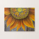 Representación abstracta estilizada de un girasol con líneas de barrido audaz y llamativos contrastes de color. El girasol, decorado en tonos dorados, amarillos y naranjas, se encuentra sobre un bonito fondo rústico de barnboard.