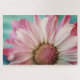 Este hermoso rompecabezas tiene un girasol rosado en un fondo verde azulado.