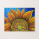 Representación abstracta estilizada de un girasol con líneas de barrido audaz y llamativos contrastes de color. El girasol se representa en tonos dorados, amarillos y naranjas.
