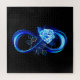 Luminous infinity symbol with glowing, beautiful, lushly blooming rose made of blue flames on black background.