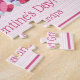 Cuatro gnomos sosteniendo letras que deletrean la palabra "AMOR" sobre un fondo de franja rosa.