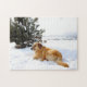¡Un día de invierno frío hacia fuera al oeste! El perro bonito del golden retriever goza de nieve fresca. Colinas y ramas de árbol nevadas de pino. La pila y la tabla de cortar de madera tajadas están próximas. Personalizable. Perrito adoptado del refugio. "De la serie del perro del rancho" cerca ella medicina del lobo.