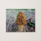 Un hongo Morel Spring se disparó de cerca que está en un Puzzle. Eso es marrón, con hierba verde y pasto marrón. Con un tallo de champiñón blanco.