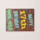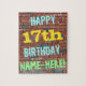 Este divertido diseño de rompecabezas con temática de cumpleaños incluye un mensaje como "¡FELIZ CUMPLEAÑOS 17, NOMBRE AQUÍ!", donde el nombre puede ser personalizado. El fondo está representado por una pared de ladrillo de ladrillo marrón rojizo. El texto del mensaje de personalizable presenta colores como azul, amarillo y verde, y tiene un aspecto inspirado en el de los graffitis pintados. Un rompecabezas como este podría ser usado como una manera divertida de enviar deseos de cumpleaños a alguien que está celebrando su decimoséptimo cumpleaños, y a quien tal vez realmente le guste hacer rompecabezas. [~Z0000285]