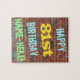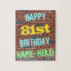 Este divertido diseño de rompecabezas con temática de cumpleaños incluye un mensaje como "¡FELIZ 81º CUMPLEAÑOS, NOMBRE-AQUÍ!", donde el nombre puede ser personalizado. El fondo está representado por una pared de ladrillo de ladrillo marrón rojizo. El texto del mensaje de personalizable presenta colores como azul, amarillo y verde, y tiene un aspecto inspirado en el de los graffitis pintados. Un rompecabezas como este podría ser usado como una manera divertida de enviar deseos de cumpleaños a alguien que está celebrando su 81º cumpleaños, y a quien tal vez le guste hacer rompecabezas. [~Z0000285]