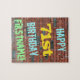 Este divertido diseño de rompecabezas con temática de cumpleaños incluye un mensaje como "¡FELIZ CUMPLEAÑOS 71, FIRSTNAME!", donde el nombre se puede personalizar. El fondo está representado por una pared de ladrillo de ladrillo marrón rojizo. El texto del mensaje de personalizable presenta colores como azul, amarillo y verde, y tiene un aspecto inspirado en el de los graffitis pintados. Un rompecabezas como este podría ser usado como una manera divertida de enviar deseos de cumpleaños a alguien que está celebrando su cumpleaños setenta y uno, y a quien tal vez le guste hacer rompecabezas. [~Z0000285]