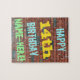 Este divertido diseño de rompecabezas con temática de cumpleaños incluye un mensaje como "¡FELIZ CUMPLEAÑOS, NOMBRE AQUÍ!", donde el nombre puede ser personalizado. El fondo está representado por una pared de ladrillo de ladrillo marrón rojizo. El texto del mensaje de personalizable presenta colores como azul, amarillo y verde, y tiene un aspecto inspirado en el de los graffitis pintados. Un rompecabezas como este podría ser usado como una manera divertida de enviar deseos de cumpleaños a alguien que está celebrando su decimocuarto cumpleaños, y a quien tal vez le guste hacer rompecabezas. [~Z0000285]