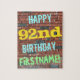 Este divertido diseño de rompecabezas con temática de cumpleaños incluye un mensaje como "¡FELIZ 92º CUMPLEAÑOS, FIRSTNAME!", donde el nombre se puede personalizar. El fondo está representado por una pared de ladrillo de ladrillo marrón rojizo. El texto del mensaje de personalizable presenta colores como azul, amarillo y verde, y tiene un aspecto inspirado en el de los graffitis pintados. Un rompecabezas como este podría ser usado como una manera divertida de enviar deseos de cumpleaños a alguien que está celebrando su noventa segundo cumpleaños, y a quien tal vez le guste hacer rompecabezas. [~Z0000285]