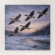 This 676-piece square jigsaw puzzle features a small flock of Greater White-fronted Geese flying over a quiet winter river at sunset, inspired by Japan’s snowy countryside.