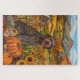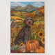 Celebra la belleza de la caída con esta vibrante pintura de un perro sentado al lado de una abundante cosecha de Acción de Gracias. Los ricos colores otoñales de las calabazas, los girasoles y el paisaje rústico de las casas de campo crean un ambiente cálido y acogedor, perfecto para cualquier amante de los perros con una decoración de temporada.