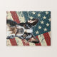 On this jigsaw puzzle, a watercolor portrait of a beautiful Boston Terrier Dog is placed against a grunge background of the USA flag. Perfect for the patriot who loves a Boston!