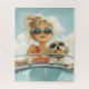 Una elegante chica joven y su florido perro disfrutan de un viaje por carretera soleado, ambos con gafas de sol, confianza y alegría exuberantes.