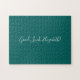 El rompecabezas de rompecabezas verde azulado sólido presenta "Good Luck, [NAME]" en un tipo de letra de guión blanco en el centro. Personaliza el texto gracioso en la barra lateral. Hace un gran regalo personalizado para alguien que ama un desafío difícil. Copyright ©Claire E. Skinner. Todos Los Derechos Reservados.