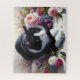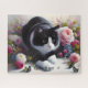 Un bonito gato blanco y negro camina a través de hermosas flores en este moderno y vibrante diseño.